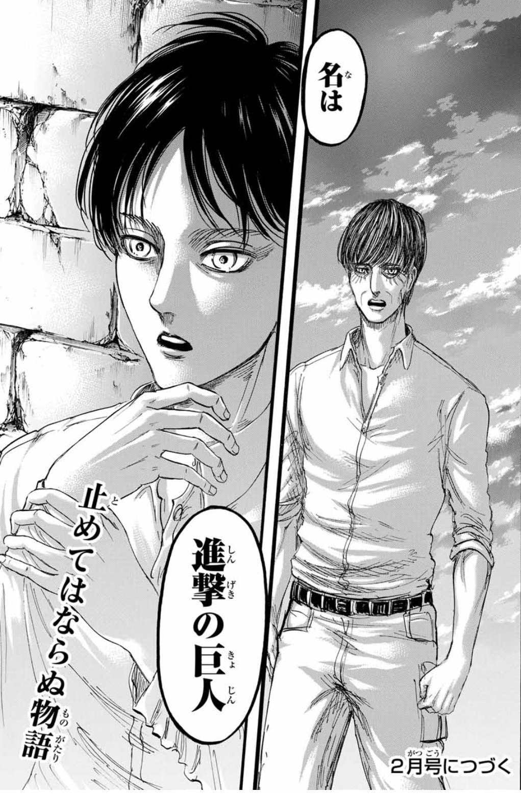 もつれら 進撃の巨人のタイトル回収シーン アニメだとパート挟んで軽くいじる感じだったけど原作は超カッコイイ大コマと煽りで読者を1ヶ月待たせてからぶち込んできたのだいぶ頭おかしいからね Shingeki T Co Garichvbns Twitter